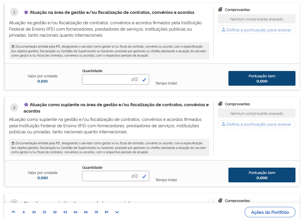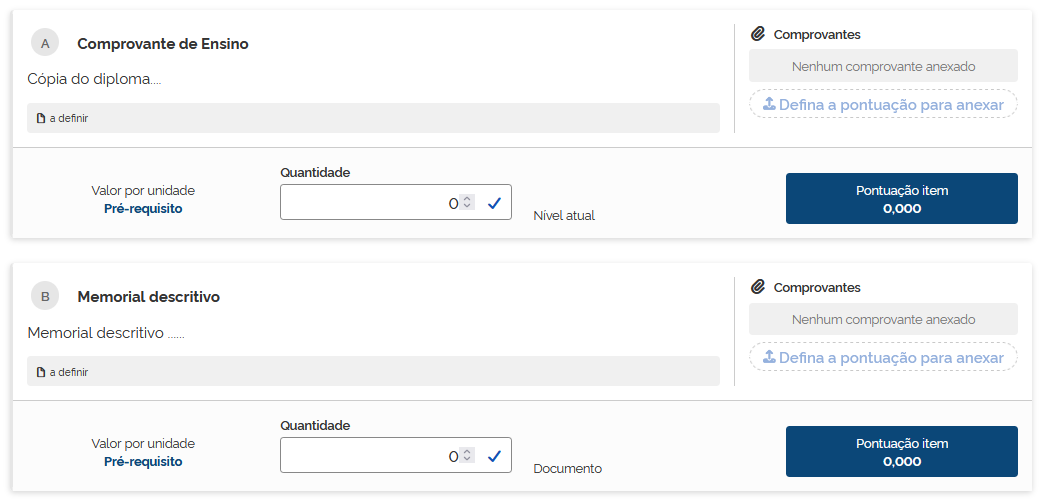 Essa é a tela principal do seu portfólio, onde os cálculos acontecem. Ela foi projetada para ser um painel de controle detalhado das suas conquistas. Você fará o upload das comprovações e acompanhará o cálculo automático da sua pontuação.