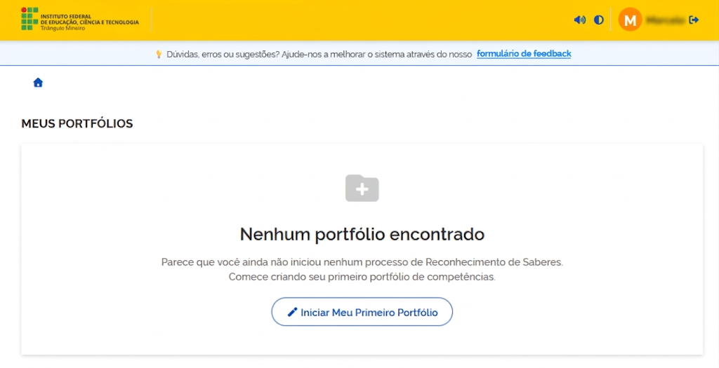 - Criando o Primeiro Portfólio: Para começar a documentar suas competências, clique no botão azul localizado na parte inferior central da tela: "Iniciar Meu Primeiro Portfólio".