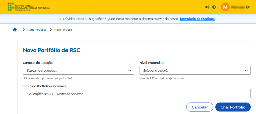 Botão Criar Portfólio: Após preencher os campos obrigatórios, clique neste botão azul para gerar seu portfólio e prosseguir para a etapa de inserção de documentos e evidências.