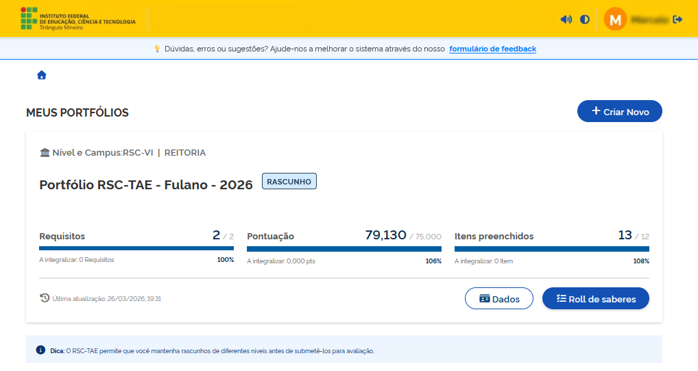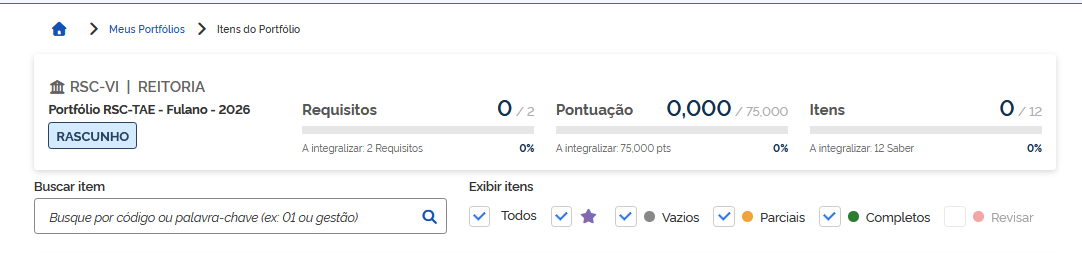 Status: Indica se o portfólio ainda é um "Rascunho" ou se já foi enviado.