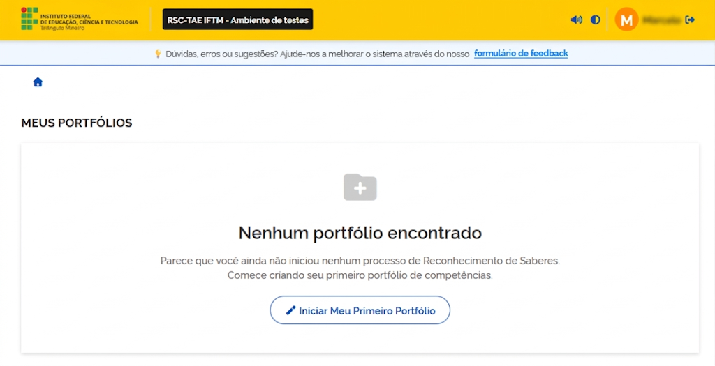 - Criando o Primeiro Portfólio: Para começar a documentar suas competências, clique no botão azul localizado na parte inferior central da tela: "Iniciar Meu Primeiro Portfólio".