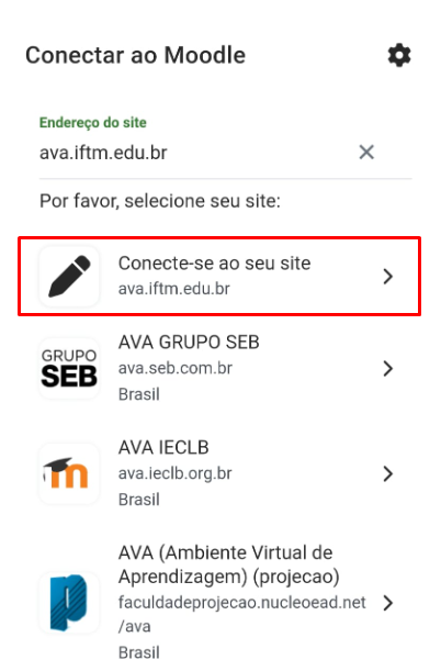 Em seguida, será solicitado o endereço do site do ambiente virtual ao qual você deseja se conectar. Insira, no campo indicado o link do moodle desejado, por exemplo: https://ava.iftm.edu.br e, posteriormente, clique em “Ligar-se ao seu site”.