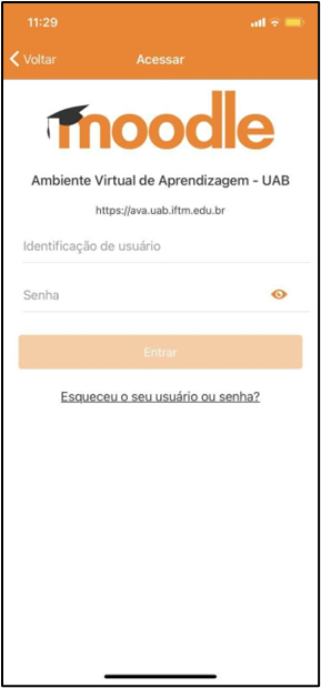 Figura 5 - Tela de login do aplicativo Moodle no sistema iOS
