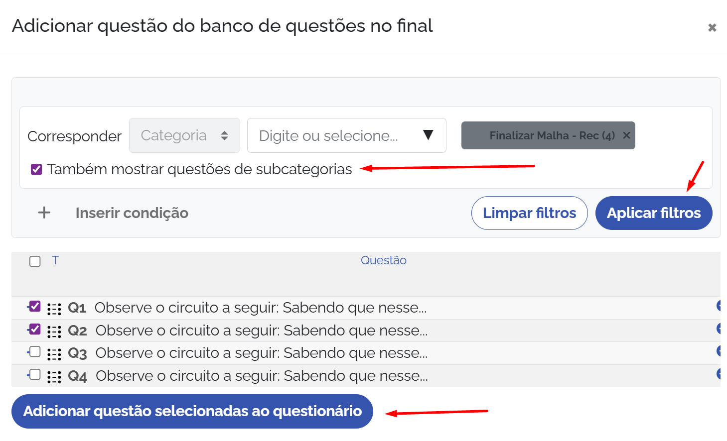 Selecione a categoria, marque a opção "Também mostrar questões de subcategorias" e clique em "Aplicar filtros"