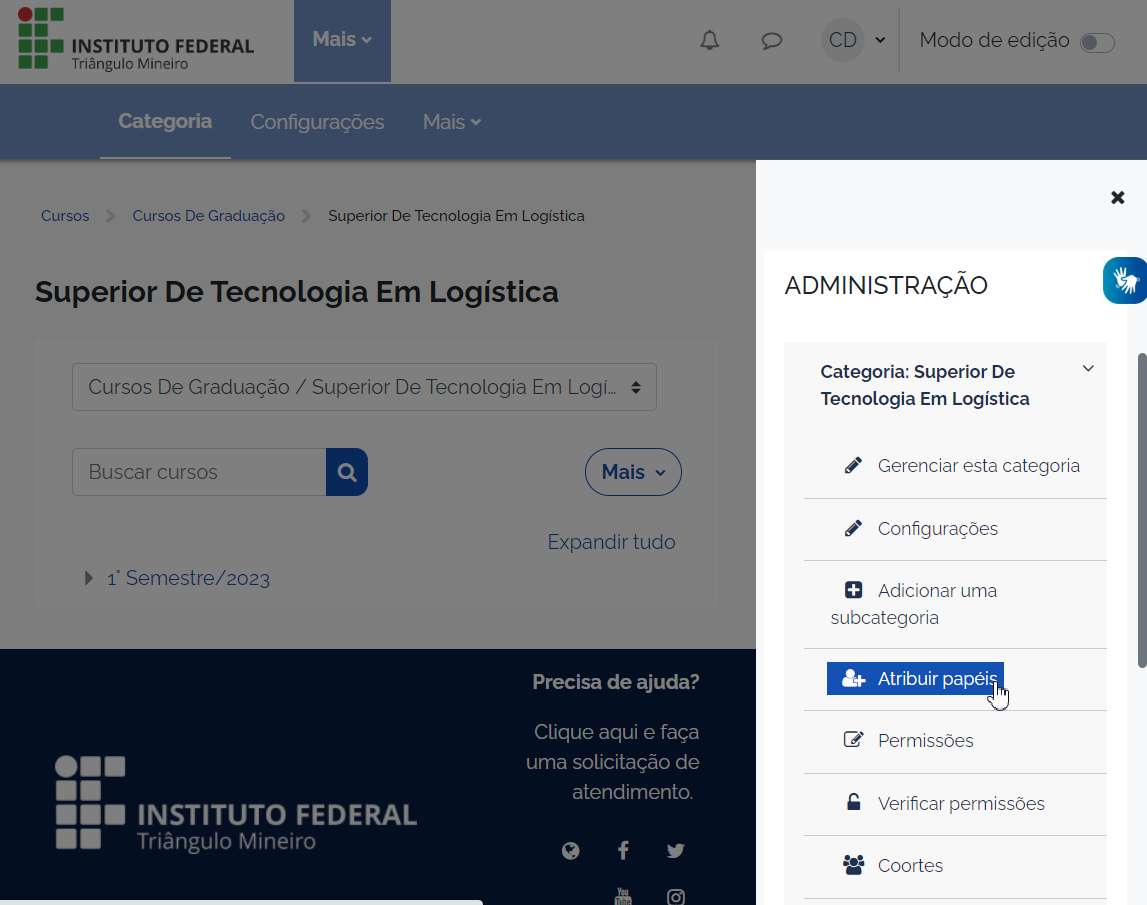 Clique na opção “Atribuir papéis” no menu lateral direito, caso o menu esteja oculto, clique na setinha “ < “, presente à direita no menu superior para que os demais blocos estejam disponíveis.