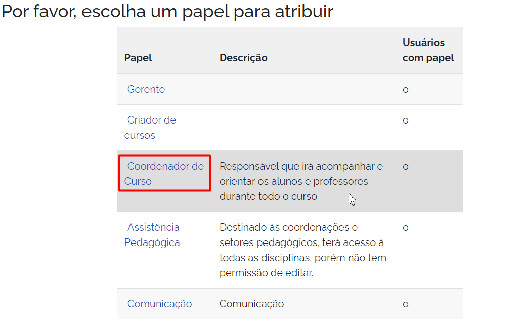A próxima tela listará quais papéis podem ser atribuídos nesta categoria, clique sob o papel “Coordenador de curso”