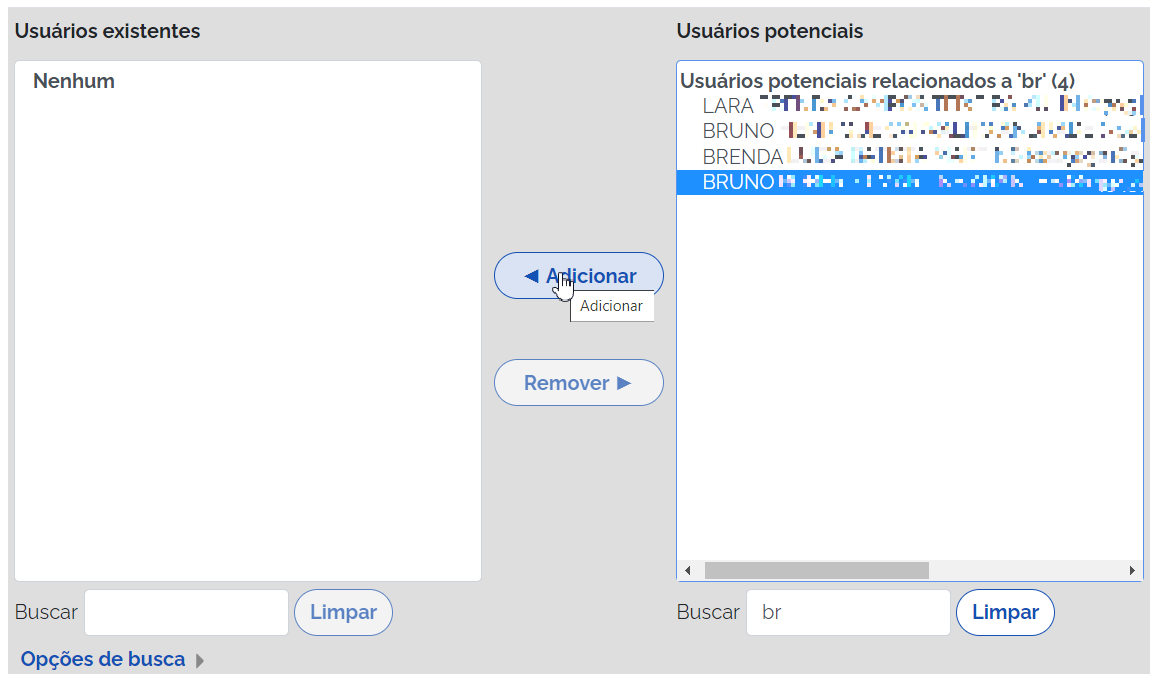 Após carregar a próxima tela, selecione o nome do coordenador a ser vinculado na coluna da direita e clique no botão “Adicionar”: