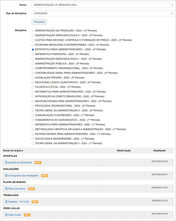 ● A visualização dos arquivos na tabela inferior só ocorre após o usuário marcar uma das disciplinas listadas.