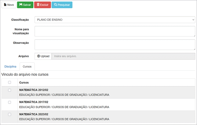 4. “Selecione as disciplinas/cursos para vincular o arquivo.”