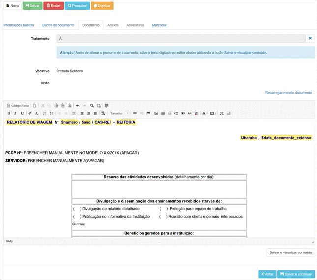 ● Modelo documento: O sistema carrega o modelo padrão do Tipo de documento selecionado na aba “Informações básicas”.