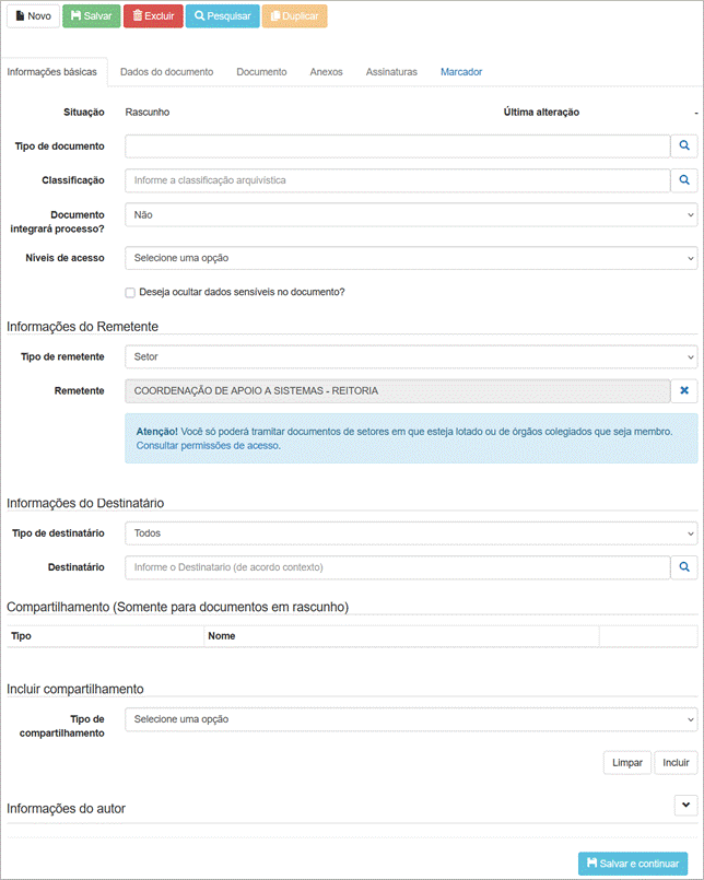 O campo “Autor” é preenchido automaticamente com o nome do usuário logado e a “Unidade de Origem” com o campus de exercício. |
