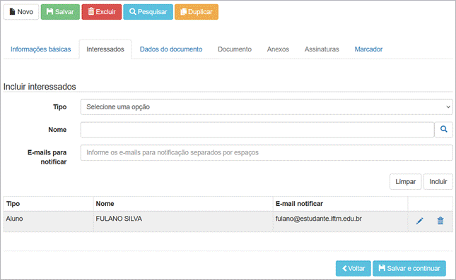Lista os interessados já vinculados ao documento. |