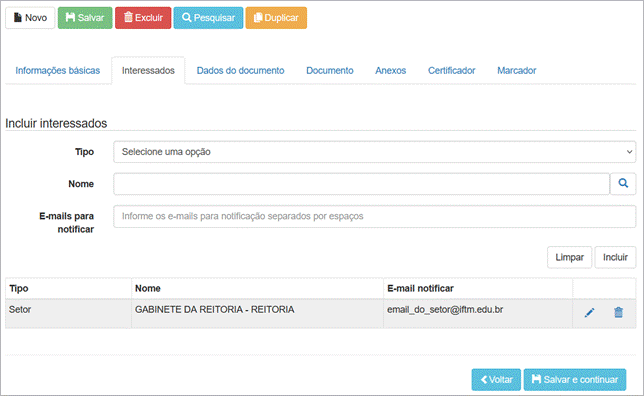 Esta aba é dedicada a listar todas as partes formais relacionadas ao documento, sejam elas internas ou externas.