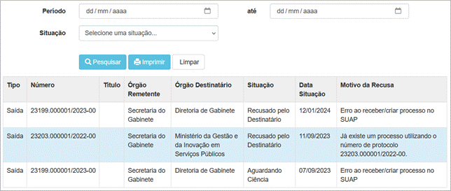Objetivo: Fornecer uma ferramenta focada para localizar trâmites de processos que foram explicitamente recusados pela unidade destinatária, ou que aguardam uma ação de ciência no contexto da troca de processos via sistemas externos (Barramento PEN). Ela é essencial para que a instituição tome as devidas providências em relação aos processos que não foram aceitos.