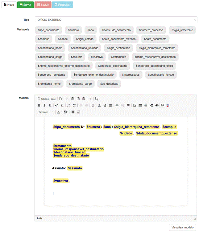 O formulário principal permite a edição do modelo de documento e possui os seguintes elementos: