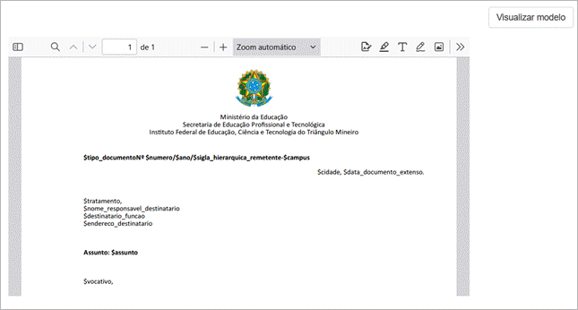 Quando o usuário clica em “Visualizar Modelo”, uma nova seção é aberta, Figura 2, exibindo o conteúdo do documento exatamente como ele foi criado no editor de texto, mas sem as opções de edição. Esta visualização permite que o usuário verifique o layout e a formatação final do documento antes de usá-lo.