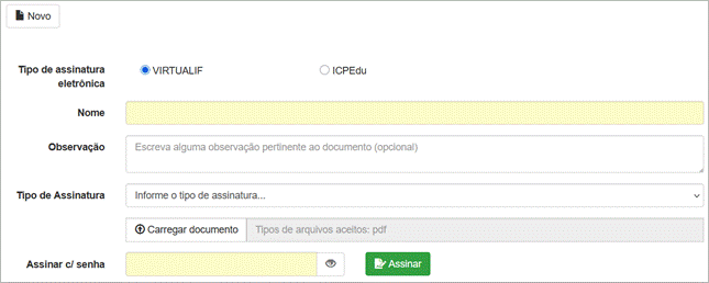 ● Tipo de Assinatura Eletrônica: Escolha entre ICPEdu ou VirtualIF. Este é um seletor principal que define o fluxo de autenticação, conforme tópico a seguir.