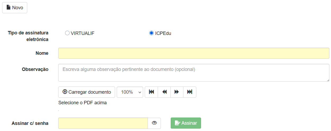 A tela consiste em um formulário para upload do documento e configuração da assinatura, dependendo do tipo de autenticação escolhido: ICPEdu (veja a Figura 1) ou VirtualIF (veja a Figura 2).