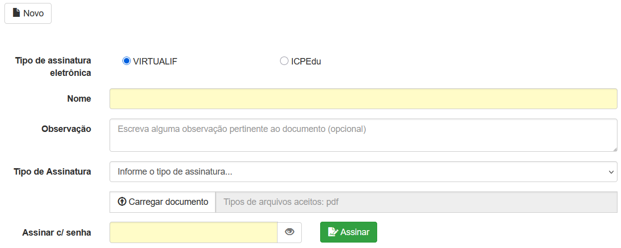 Tipo de Assinatura Eletrônica: Escolha entre ICPEdu ou VirtualIF. Este é um seletor principal que define o fluxo de autenticação, conforme tópico a seguir.