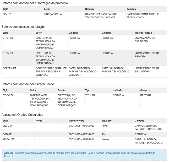 O acesso a documentos de órgãos colegiados depende de o usuário possuir vínculo ativo como membro no momento da consulta ou tramitação. Ou seja, o sistema DOCS somente permite visualizar, elaborar ou tramitar documentos relacionados a um órgão colegiado enquanto a vigência da participação do usuário nesse colegiado estiver válida.
