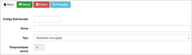 ● Nome: Informe o nome da classificação arquivística (por exemplo, “Projetos de Ensino”). Este campo é obrigatório.