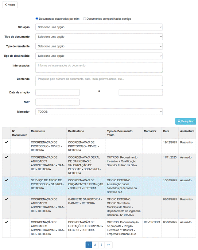 A tabela exibe a lista de documentos que correspondem aos filtros aplicados. A coluna “Assinatura” indica o status atual do documento no fluxo de trabalho, sendo: