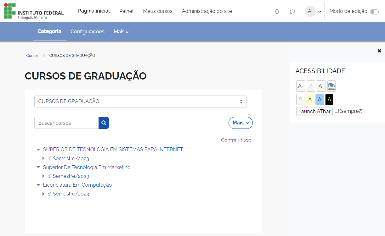Já a edição da disciplina, ativada para atualização e inserção de recursos, pode ser habilitada através da opção “Modo de edição”, disponível à esquerda no menu superior.